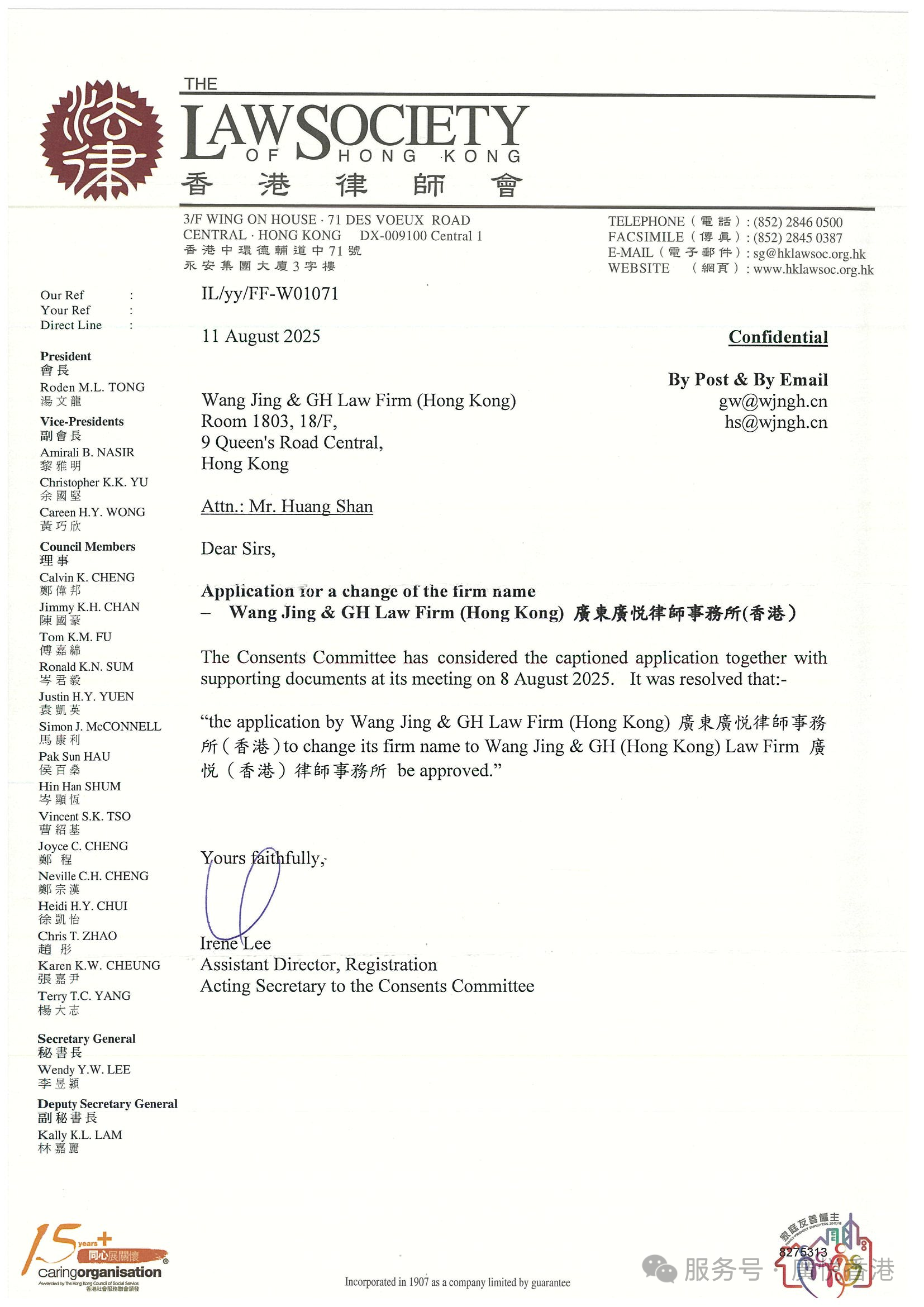 (香港律師會關於廣悅香港更名的批復)
