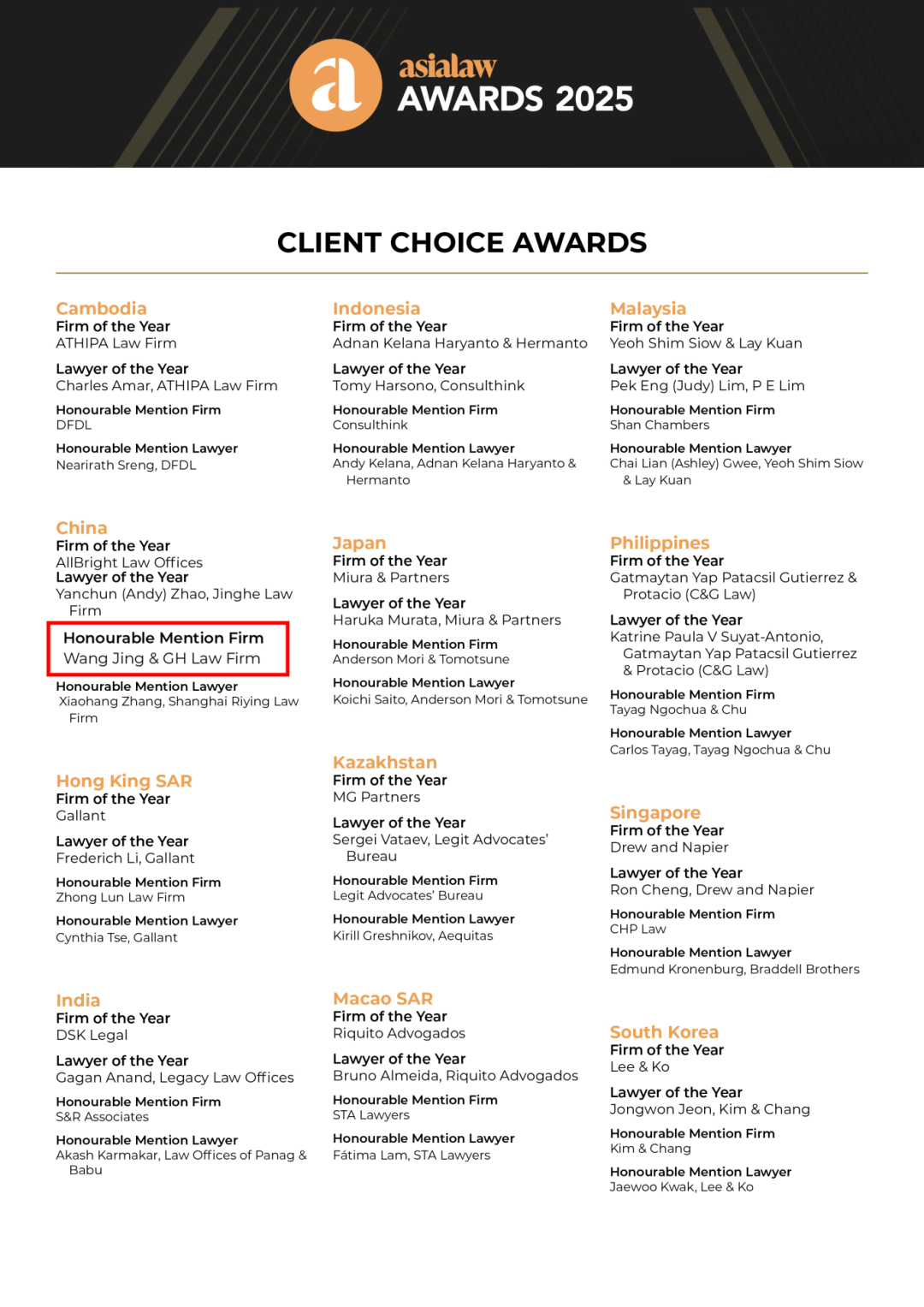 2025年11月6日,國際法律評級機構《亞洲法律概況》(asialaw)在越南胡誌明市舉辦2025年度亞洲法律大獎(asialaw Awards 2025)頒獎晚宴,並正式揭曉獲獎名單。作為亞洲法律界極具影響力的權威指南,該機構的調研與排名已覆蓋 20 個司法管轄區及 28 個執業領域,是亞洲法律領域最具影響力的法律榜單之一。廣悅律師事務所榮獲“客戶首選大獎(CLIENT CHOICE AWARDS)”提名,也是此次該獎項中唯一獲提名的大灣區律師事務所。