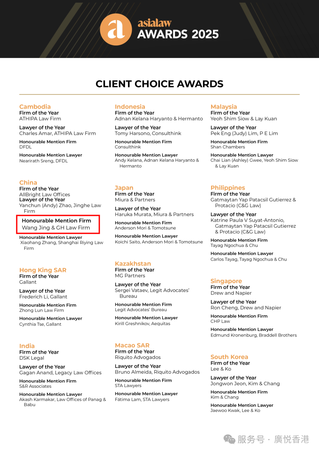2025年11月6日,國際法律評級機構《亞洲法律概況》(asialaw)在越南胡誌明市舉辦2025年度亞洲法律大獎(asialaw Awards 2025)頒獎晚宴,並正式揭曉獲獎名單。作為亞洲法律界極具影響力的權威指南,該機構的調研與排名已覆蓋 20 個司法管轄區及 28 個執業領域,是亞洲法律領域最具影響力的法律榜單之一。廣悅律師事務所榮獲“客戶首選大獎(CLIENT CHOICE AWARDS)”提名,也是此次該獎項中唯一獲提名的大灣區律師事務所。