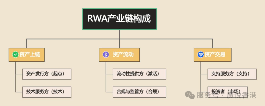 RWA產業鏈由多個參與主體協同構成,形成從資產上鏈到市場流通的完整閉環,主要包括以下環節: